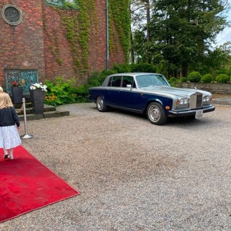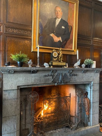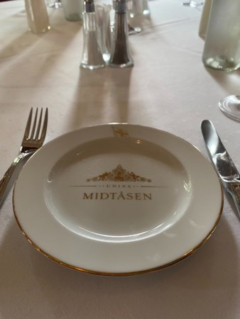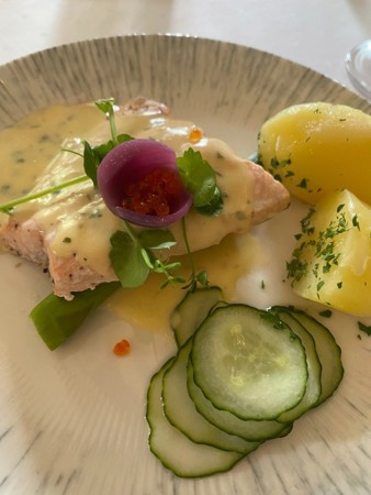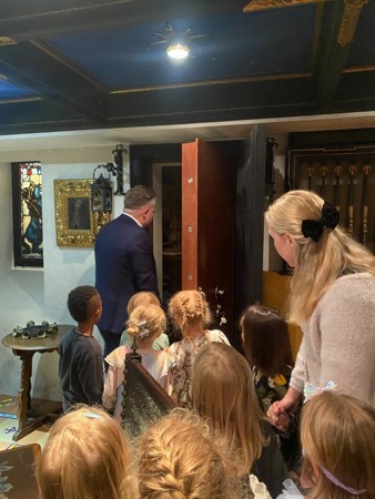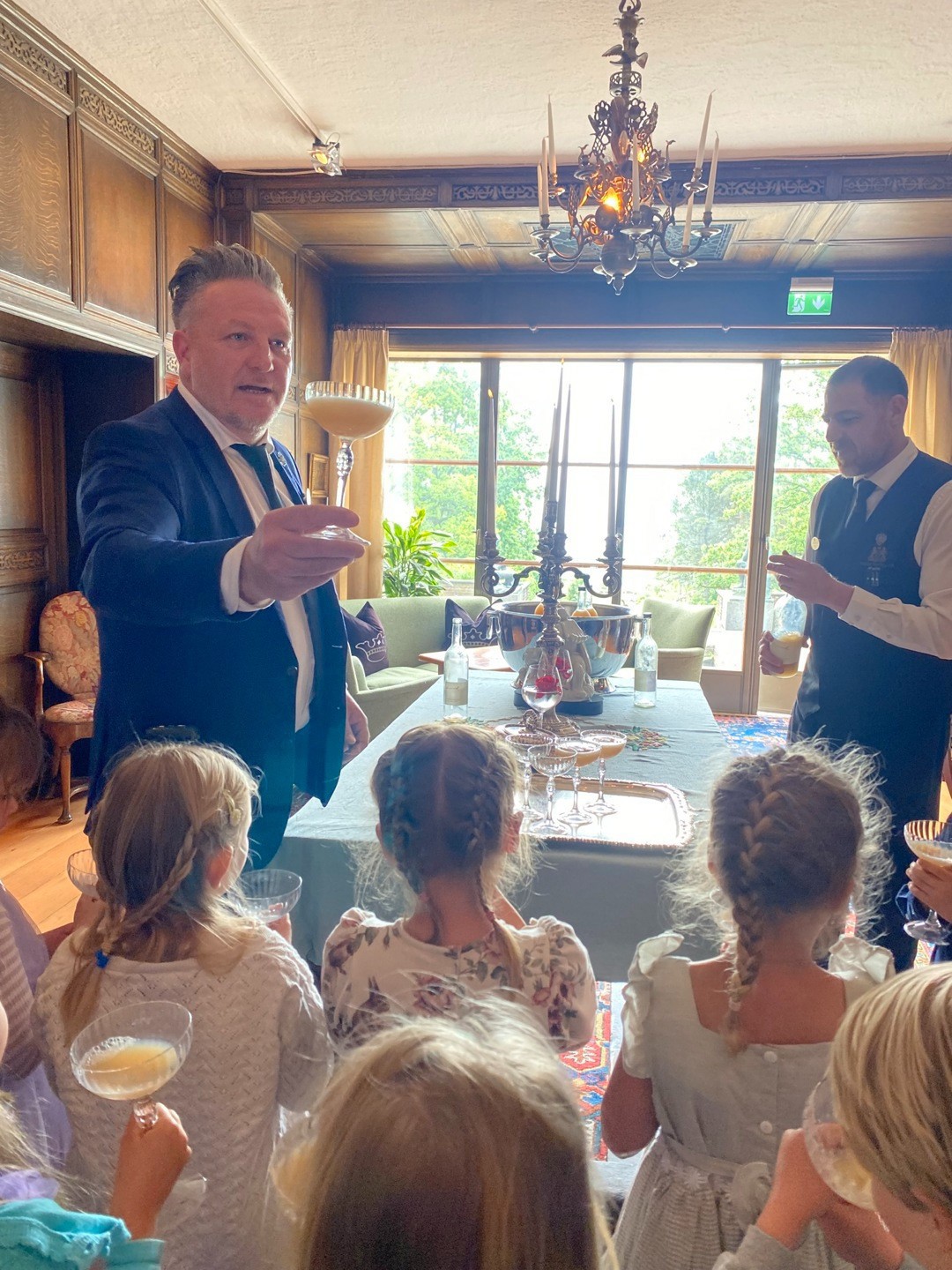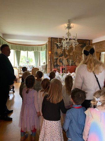 Vi ble møtt av Nikolai Girlando som kom kjørende i den flotte bilen til Anders Jahre og gikk inn hovedinngangen på rød løper. Inne ble vi mottatt med en pyramide av glass med deilig eplemost fra Lund (der vi var i høst), før vi fikk en spennende omvisning i huset. Vi fikk høre mange spennende historier om Anders Jahre og om tingene hans. Vi var på kontoret hans hvor det står en gammel telefon. Og i både hvelvet og vinkjelleren hans før vi satte oss til bords i Arnebergstuen, som ble bygget for å romme tre flotte gobeliner fra 1600 tallet. Der fikk vi servert nydelig laks med Sandefjordsmør, poteter, agurksalat, ertespirer og Asparges.